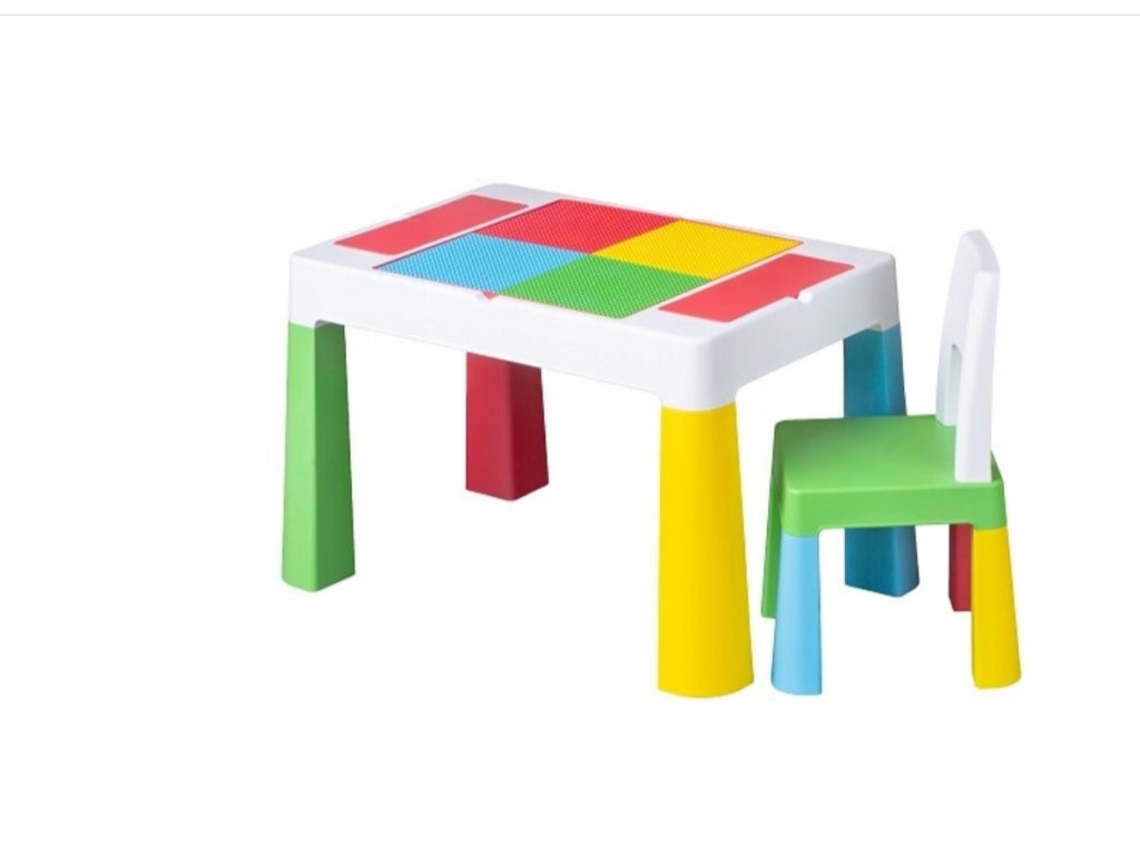 Pracovná "doska" stola je multifunkčná - na jednej strane je hladká, na druhej strane je "stavebnicová" kompatibilná s Lego kockami. Vrchná časť stola je demontovateľná - sú pod ňou úložné priestory s hĺbkou cca 8 cm, do ktorých upracete ceruzky, pastelky, výkresy či iné hračky.